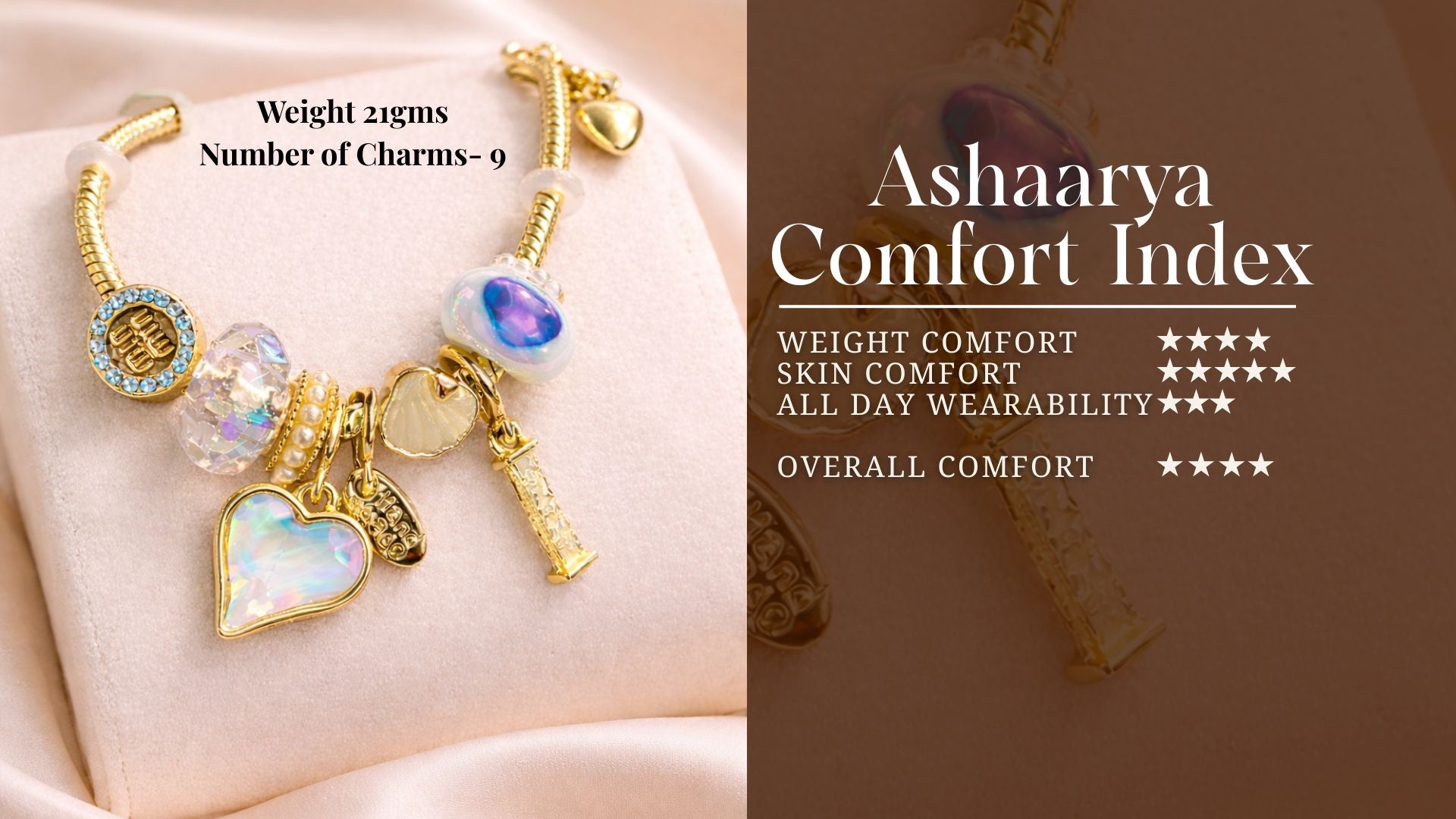 At Ashaarya, luxury is comfort. Every piece is measured with the Ashaarya Comfort Index™ — for weight, skin feel, fit, and ease — so jewellery feels as effortless as it looks.